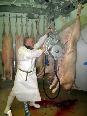 Une opération de démédulation est également effectuée avant la fente de la carcasse. Considérée comme MRS, la moelle épinière est aspirée puis détruite.